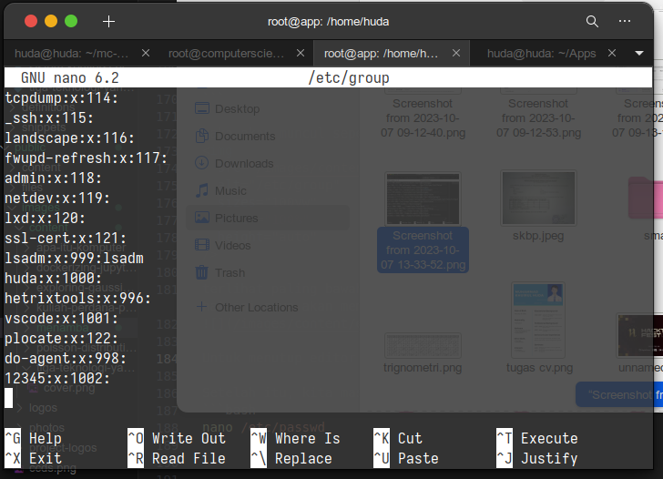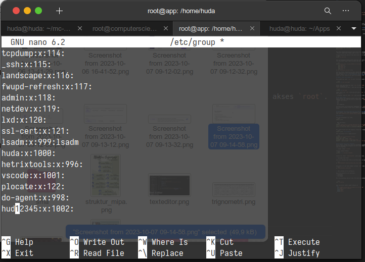 nano /etc/grouplalu baris paling bawah akan ada tulisan hud12345 yang bisa disesuaikan dengan username yang diiinginkan.