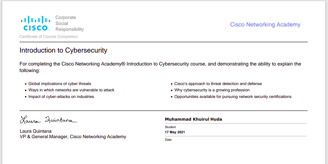 Mencoba kursus - kursus tingkat dasar yang berkaitan. Disini saya sudah mencoba beberapa kursus yang diadakan oleh Cisco secara gratis yaitu "Introduction to Cybersecurity"